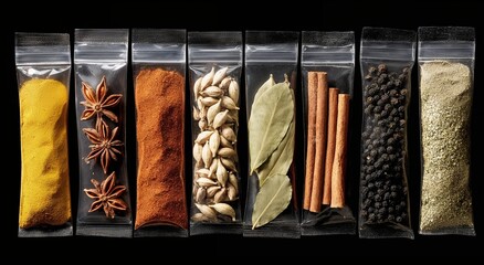 Colorful array of spices and herbs displayed in jars with assorted seeds and grains on black background