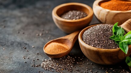 An artistic display of assorted spices in wooden bowls, emphasizing colors, textures, and the culinary world, inviting viewers to explore the richness of flavors.