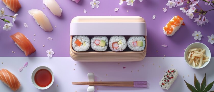 Elegant Sushi Bento Box with Assorted Sushi Rolls and Japanese Cuisine on a Pastel Background
