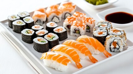 Elegant arrangement of assorted sushi with soy sauce and chopsticks