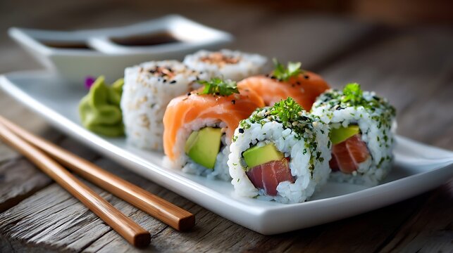 Assorted fresh sushi rolls with tuna, salmon, cucumber, and avocado served on a white plate with garnish