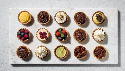 Assorted gourmet tarts on marble board with various toppings