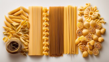 Assorted uncooked pasta variety on light background