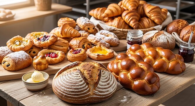 An assortment of freshly baked bread and pastries on a wooden table, artistically arranged with rustic background