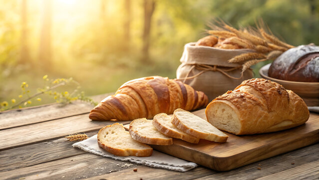 Delicious assortment of freshly baked bread and croissants on a rustic wooden table outdoors