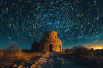 Star trails above old pueblo ruins.