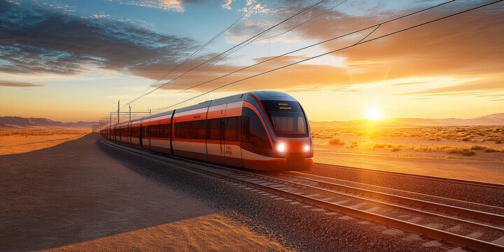 ast train moves under desert sunset with long track lines