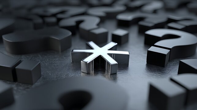 Metallic Silver Asterisk Symbol Among Black Question Marks on Dark Surface