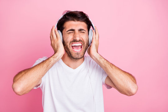 Portrait of funny funky positive middle astern singer man have rest relax use headset listen favorite song sing enjoy free time weekends wear style clothes isolated over pastel color background
