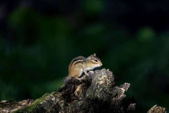 The astern chipmunk (Tamias striatus)  on old tree trunk in the forest