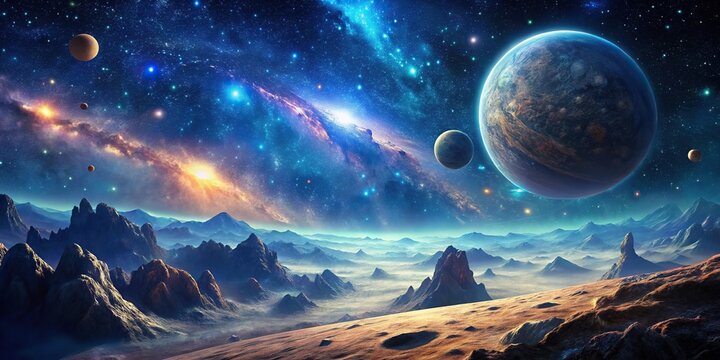 Deep space galaxy landscape with mountains, valleys, and asteroid fields in a stunning astronomical scene, deep space, cosmic rocks, valley formations
