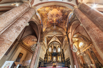 Asti, Italy - Apsis of San Secondo collegiate church ( 7th century; 10th; 15th ), Gothic style interior arch architecture with fresco, is the oldest church in Asti