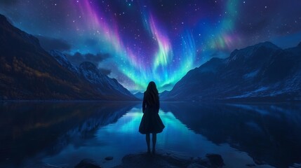 Astonishing Woman Standing on a Rock Gazing at the Vibrant Aurora Borealis Illuminating the Night Sky with Brilliant Colors Creating a Magical and Inspiring Natural Scene in the Wilderness