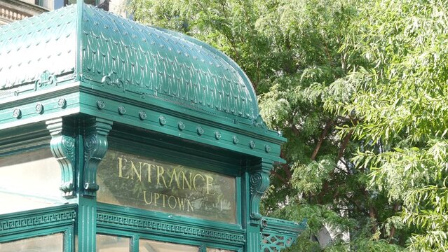 New York City subway, Astor Place underground metro, green iron kiosk. Metropolitan vintage entrance, public passenger transport retro historic exit. NYC old architecture, Manhattan, United States.