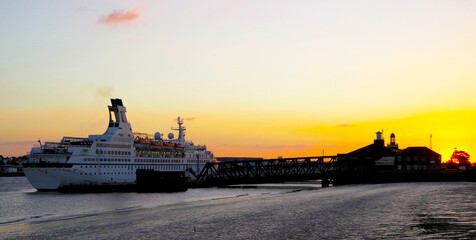 Small classic white cruiseship or cruise ship liner Astor on River Thames at Tilbury port near London during twilight sunset blue hour