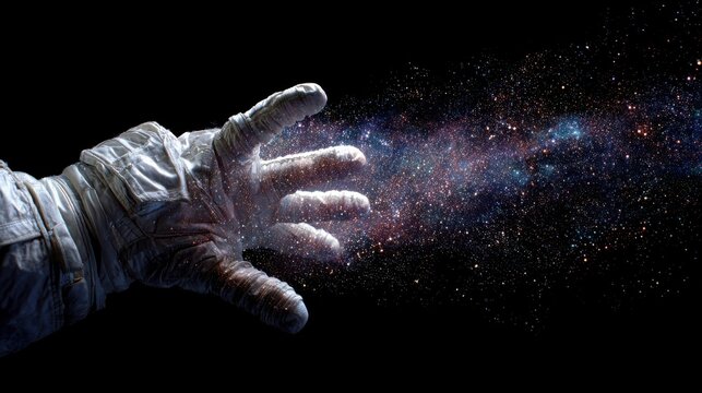 Astronaut's gloved hand reaches out to touch the cosmos in stunning colorful display
