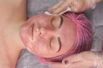 Hands of cosmetician, female face. Girl with problematic skin.