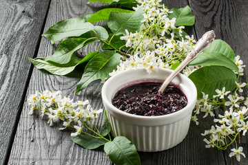 Medicinal plant bird cherry (flowering branches and jam)