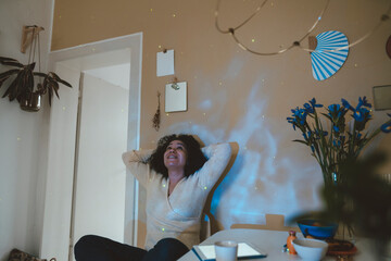 Cosmic dreamscape with luminous contrails in starry night sky