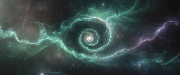 A cosmic emerald spiral nebula swirls amidst stardust and dark matter creating celestial beauty