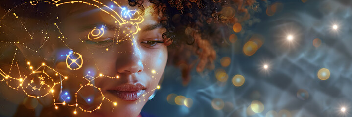 A young black woman astrologer makes an astrological forecast. Concept of horoscopes, tarot cards and numerology. Banner, copy space
