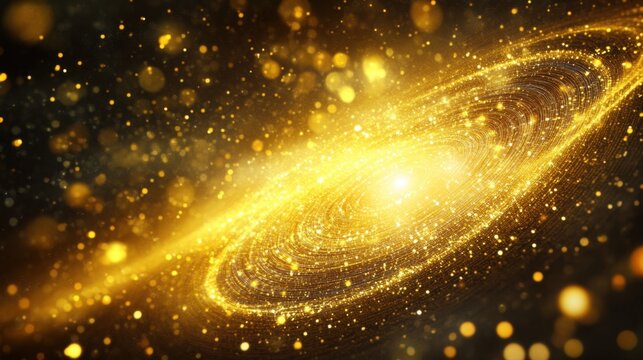 Cosmic spiral galaxy with golden light particles in a glowing space scene