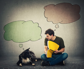 Curious purebred border collie dog and his master reading together an interesting book