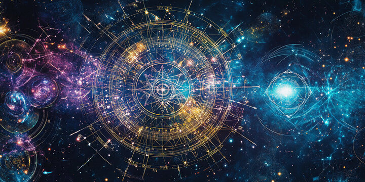 Sacred geometry, cosmic energy, and astrology symbols blend in a mystical universe. Celestial maps, star alignments, and divine patterns reveal the hidden secrets of the cosmos