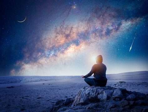 person meditating at night under the Milky Way Moon and shooting star