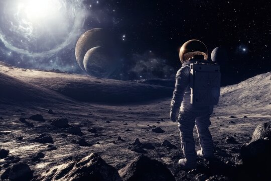 Astronaut Exploring Moon Surface With Distant Planets Images