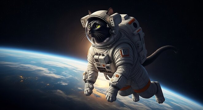 A black cat astronaut floats in space, wearing a spacesuit, near Earth.