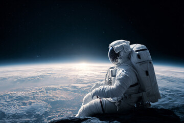 Astronaut floating above earth's atmosphere with a stunning sunrise