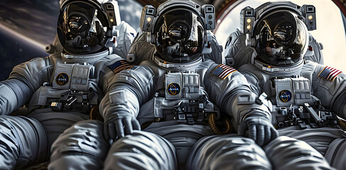 A group of astronauts working together on a space mission. They were wearing white astronaut suits.