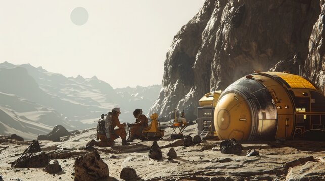 Two astronauts rest beside their space habitat surrounded by rocky terrain during sunset on a Martian expedition.