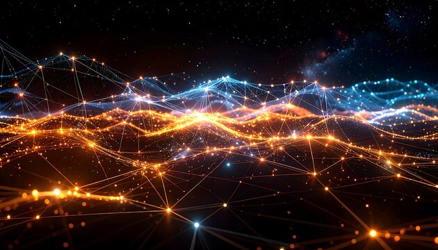 Earth at night, illuminated cities and glowing network connections, set against a starry backdrop