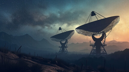 Telescope and celestial bodies like the moon, stars, and planets in night.