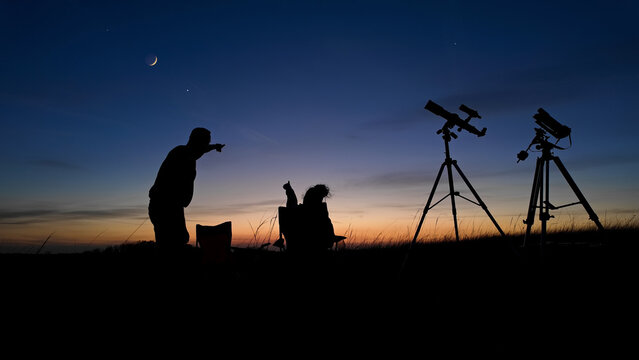 People enjoying watching and stargazing with astronomy telescopes outdoors in nature, observing planets, Moon and other celestial objects.