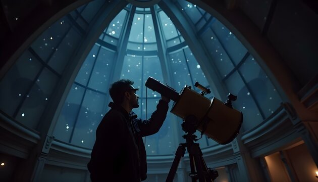 An astronomer peering through a massive telescope under a domed observatory roof, with stars and constellations projected across the walls, exploring the wonders of the night sky.