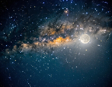 A view of the night sky featuring the galaxy, stars, and a full moon.