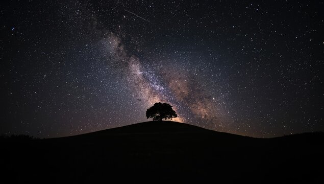 Dark hill outline against a starry night sky serving as a visual for night sky photography, World Night Sky Awareness Day