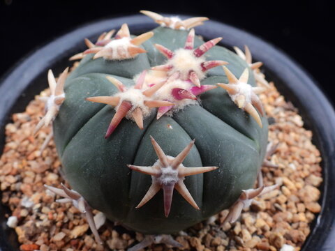 Astrophytum cactus close up with Akadema stone . Astrophytum Catus in black pot. Astrophytum asterias cactus. Top view of Astrophytum Asterias .