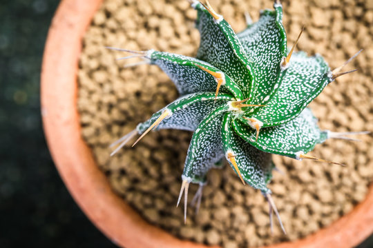 Top view of cactus in Clay pots. Image has shallow depth of field. Astrophytum asterias