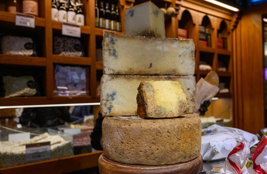 Different Asturian cheeses made from cow, goat and sheep melk on display in farmers cheese shop, Asturias, North Spain