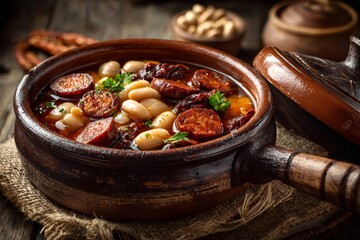 Delicious asturian bean stew with chorizo and parsley in clay pot on wooden table