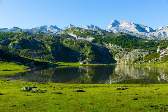 Serene landscape with one of Lakes of Covadonga and mountain range in summer day