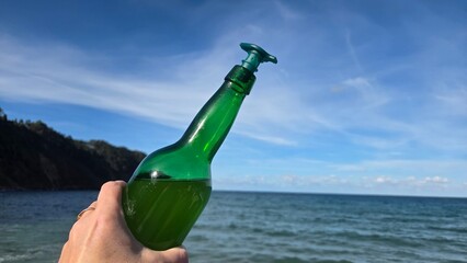 Enjoying asturian cider by the sea on a sunny day. Horizontal banner. Copy space. Travel, tourism concept. Green bottle of cider in hand with ocean view