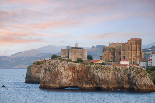 Santa maria de la asuncion church and lighthouse overlooking the cantabrian sea at sunset in castro urdiales, spain