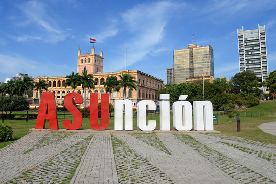 Asuncion sign in front of the Government Palace in colonial style. Park with trees and downtown buildings visible. Popular photo spot in Paraguay.