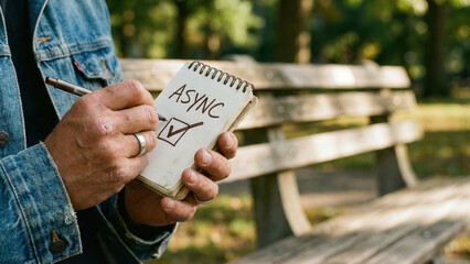 Person holding notebook with ASYNC written it, showing sense of contemplation and planning outdoor park bench setting focus thoughtful task