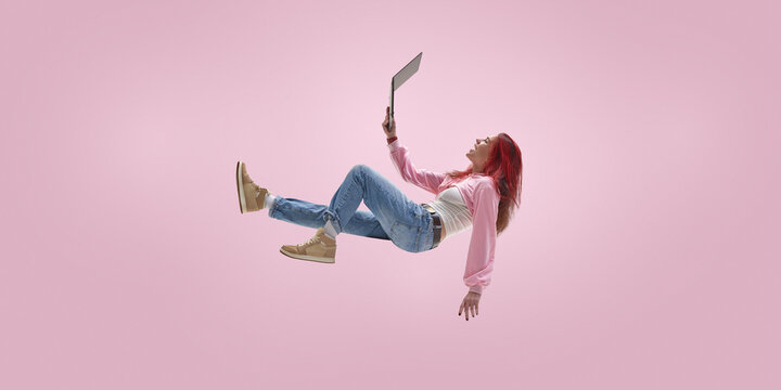 Remote freelancer floating while managing projects on laptop. Concept of project based work, async collaboration, digital nomad lifestyle, modern freelance productivity and mobility.